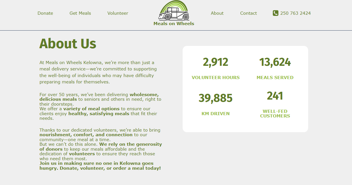 Meals on Wheels Kelowna has been supporting seniors and individuals in need for over 50 years by delivering nutritious, home-style meals directly to their doors. With a range of healthy options and the help of dedicated volunteers and donors, we provide nourishment, comfort, and connection—ensuring no one in our community goes hungry.
